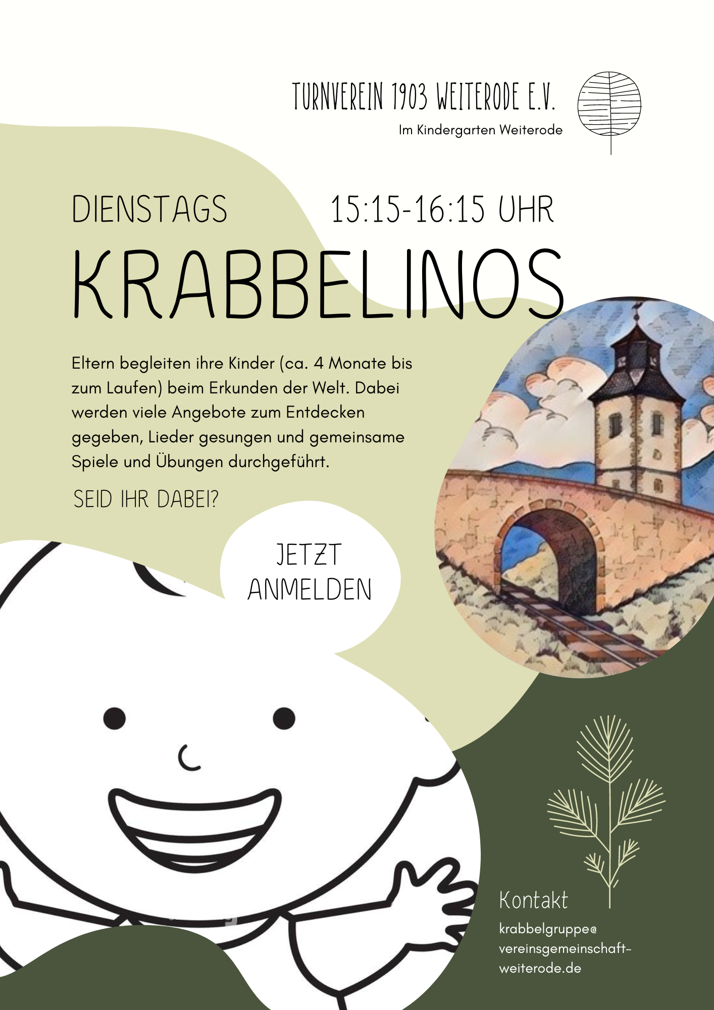 Eltern begleiten ihre Kinder (ca. 4 Monate bis zum Laufen) beim Erkunden der Welt. Dabei werden viele Angebote zum Entdecken gegeben, Lieder gesungen und gemeinsame Spiele und Übungen durchgeführt. Bei Interesse meldet euch gerne unter